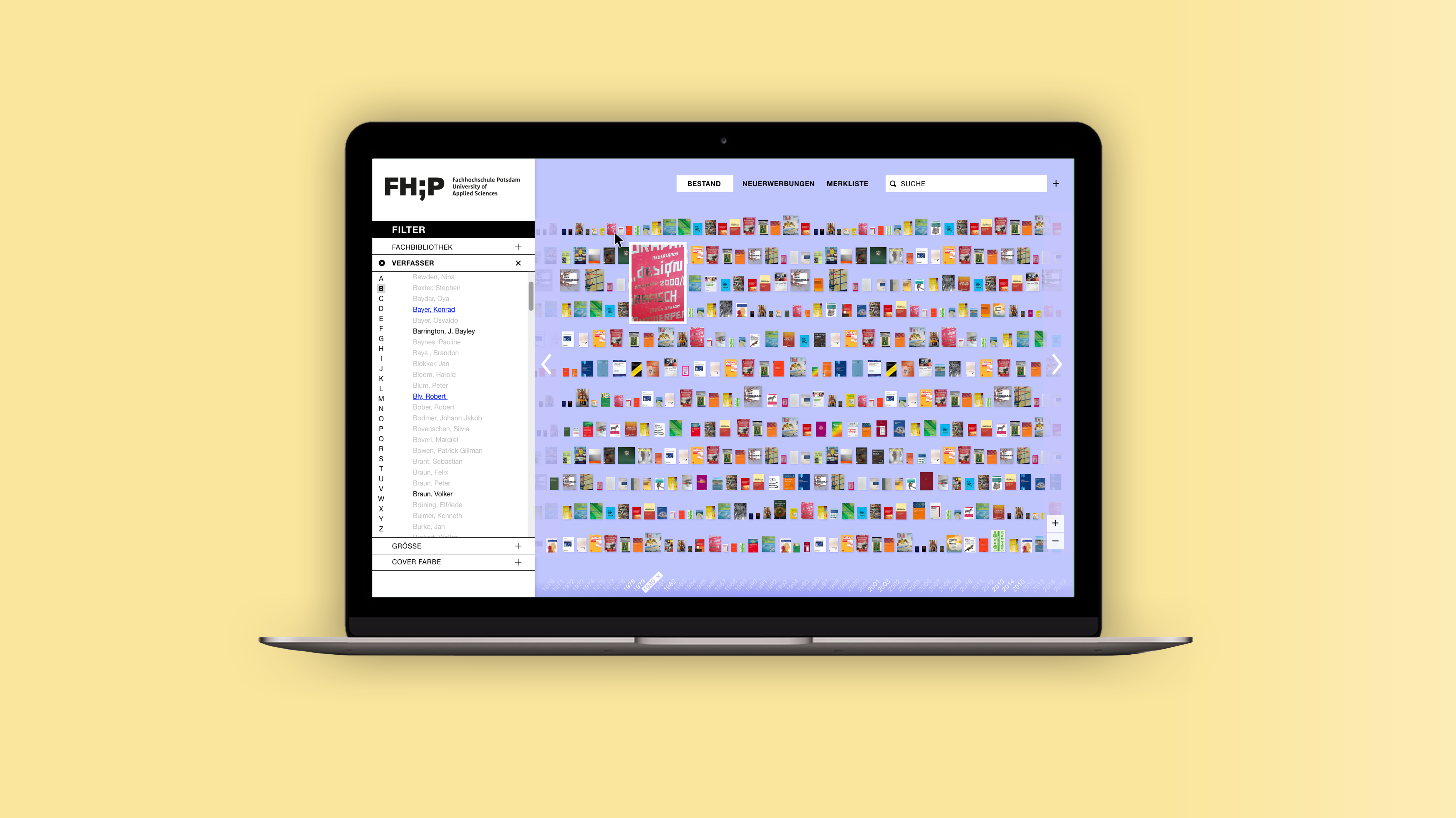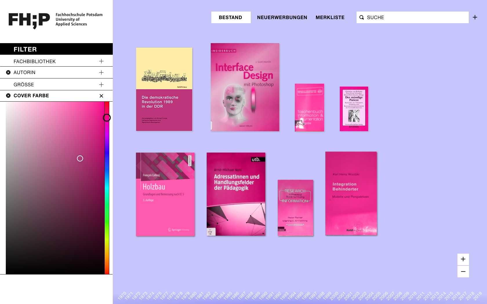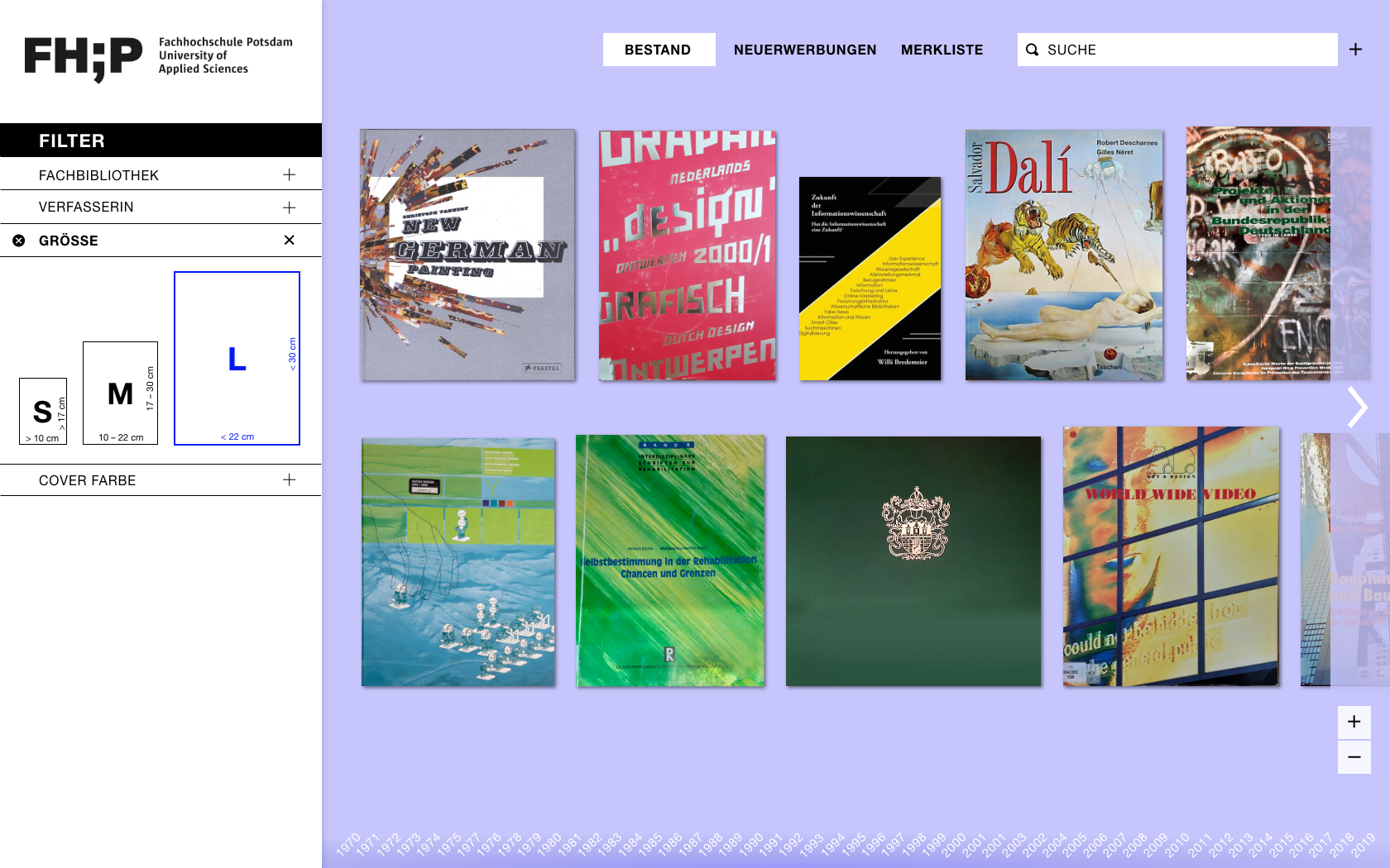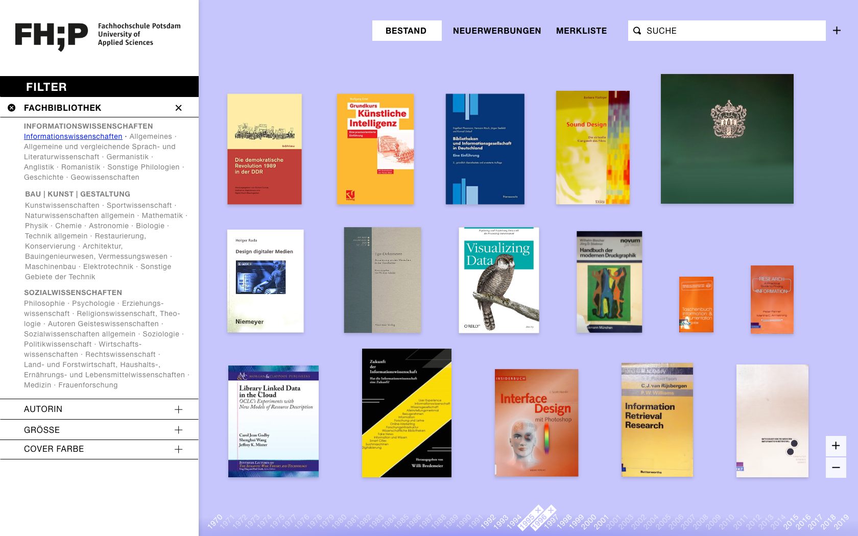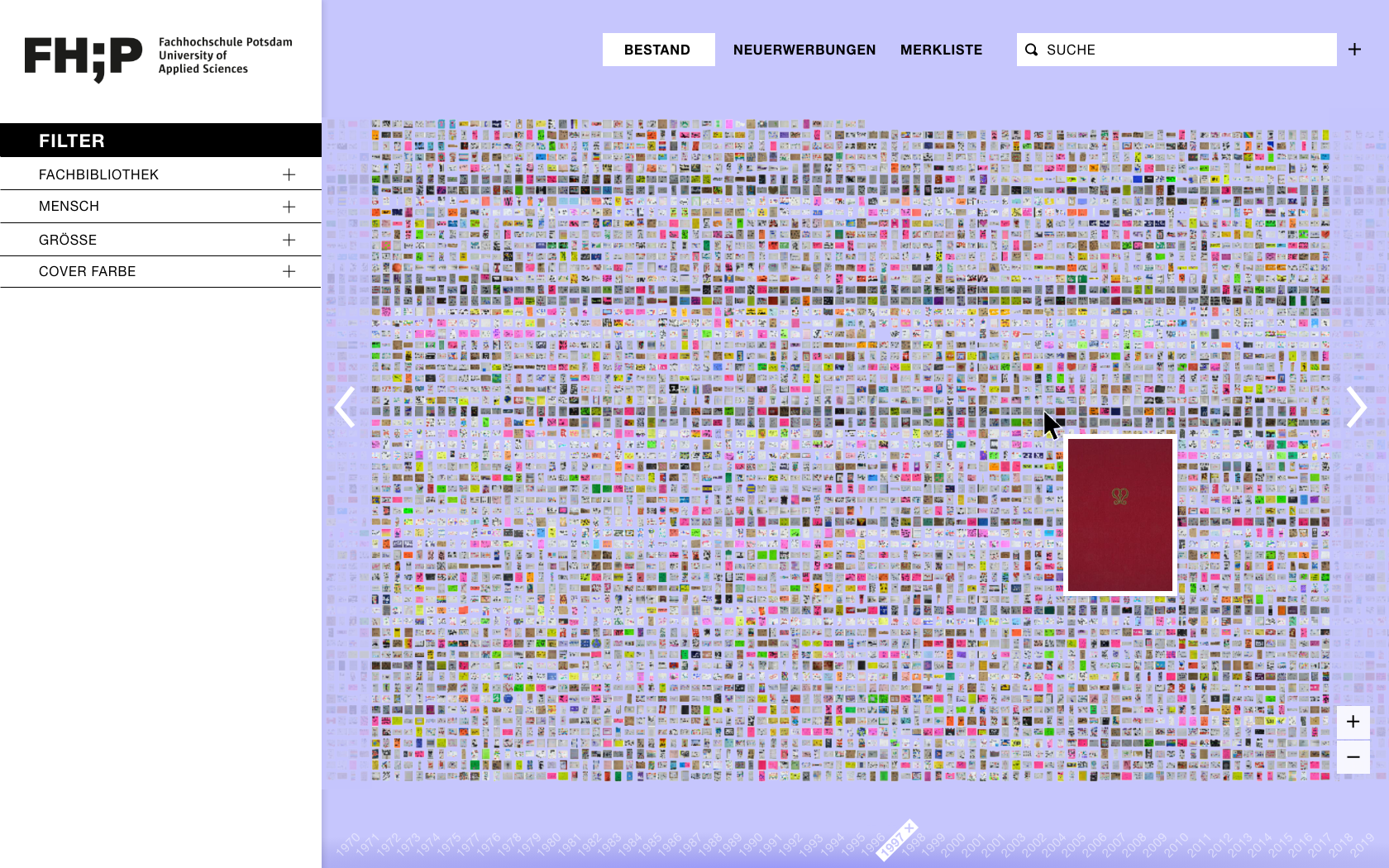 Beim Öffnen der Website wird der Bestand aus einer Makroperspektive inszeniert und Bücher als Thumbnails präsentiert. Die Übersicht soll den Umfang des Bestandes ersichtlich machen und eine umfassende, überblicksartige Interaktion damit ermöglichen. Die Sortierung einzelner Objekte, sollten keine Filter angewendet worden sein, unterliegt einem programmierten Zufallsprinzip, das bei jedem Aufruf der Seite eine neue Anordnung erzwingt. Mit Hilfe der Pfeilelemente können Nutzer durch den vollständigen Bestand navigieren. Die Ansicht kann durch Scrollen oder durch die dafür vorgesehenen Steuerungselemente am rechten Bildschirmrand gezoomt werden. Die Maße (Breite und Höhe) eines Buches werden durch die Abbildung des Covers maßstabsgetreu in den digitalen Raum übersetzt, wodurch Größenverhältnisse sichtbar werden. Ein optischer Bezug zum physischen Exemplar entsteht, welches sich bei der Suche in der analogen Bibliothek dadurch schneller identifizieren lässt.