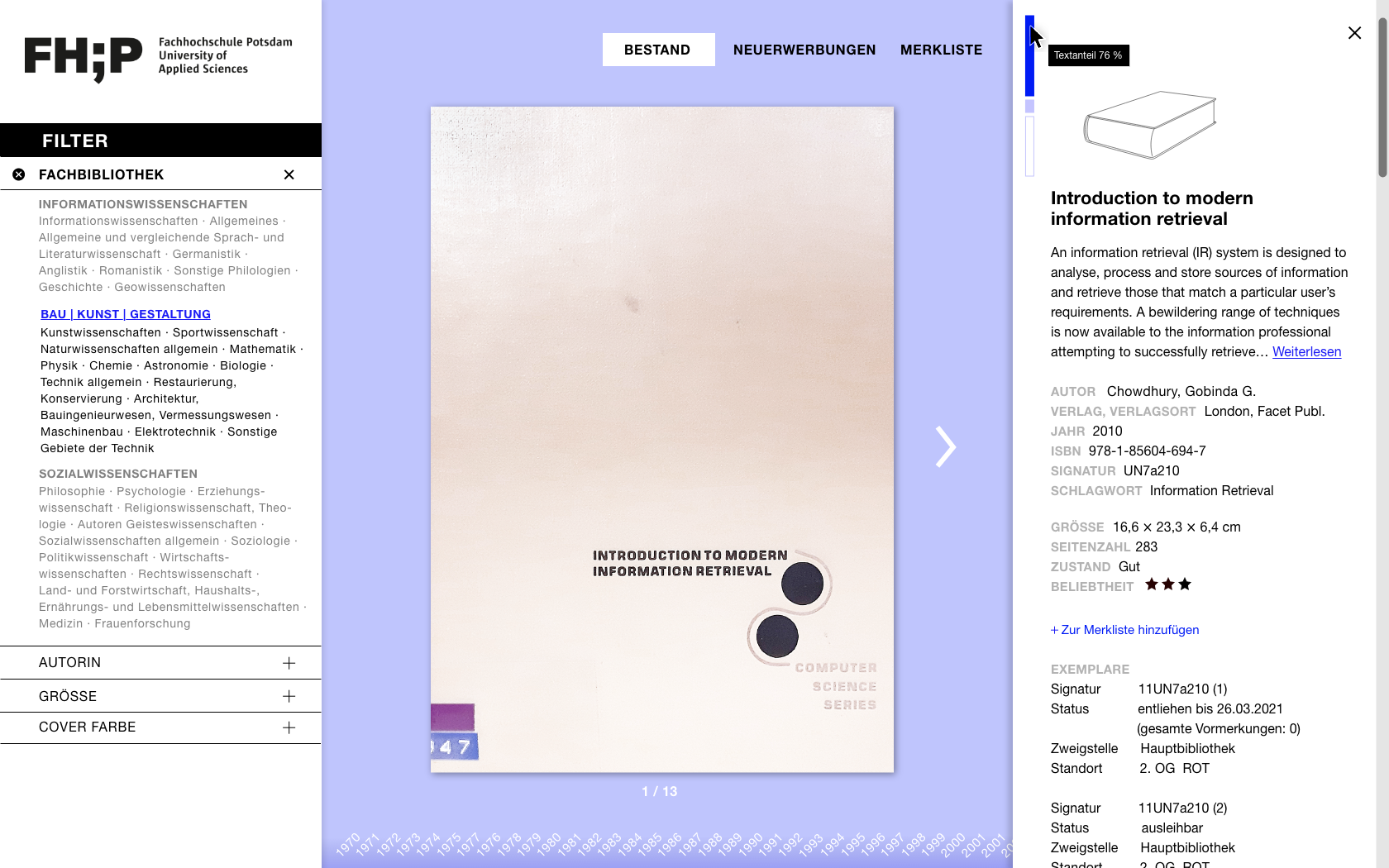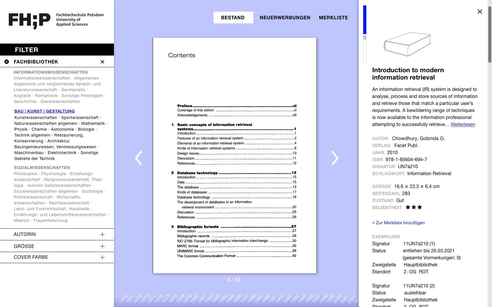 In der Detailansicht wird das Cover vergrößert und hochauflösend dargestellt. Es lässt sich durch die ersten Seiten des Buches blättern und somit auch das Inhaltsverzeichnis einsehen. Die Seitenleiste bietet ausführliche Informationen zum Werk wie Titel, Verfasser, Verlag, ISBN, Signatur, Schlagwort sowie eine Kurzbeschreibung.
